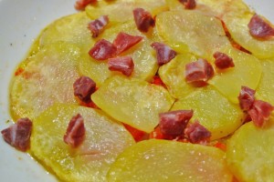 4- Col•loquem una capa de patates. Hi posem una mica de pebrot repartit per sobre les patates. Ho condimentem amb un rajolinet més d’oli, sal i espècies.